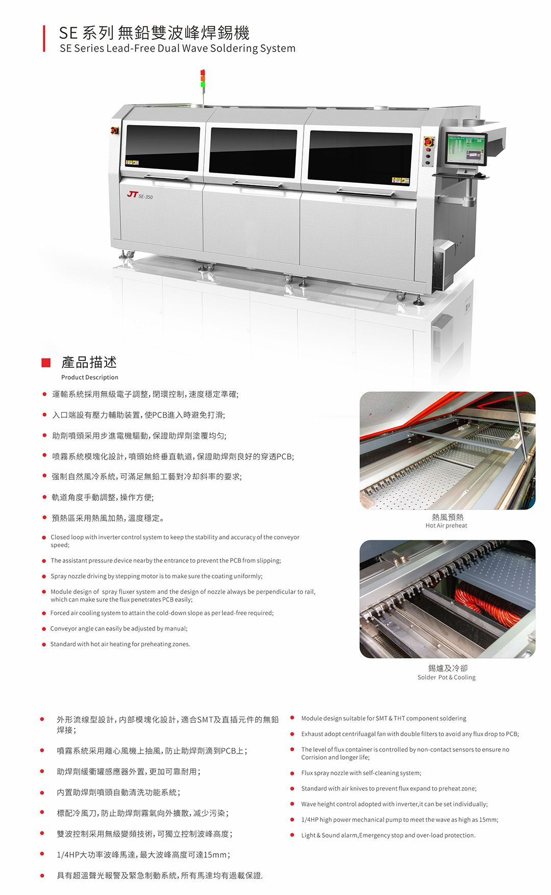 外形流線型設(shè)計,內(nèi)部模塊化設(shè)計,適合SMT及直插元件的無鉛焊接。 噴霧系統(tǒng)采用離心風(fēng)機上抽風(fēng),防止助焊劑滴到PCB上。 助焊劑緩沖罐感應(yīng)器外置,更加可靠耐用。 標(biāo)配冷風(fēng)刀,防止助焊劑霧氣向外擴散,減少污染。 雙波控制采用無極變頻技術(shù),可獨立控制波峰高度。 1/4HP大功率波峰馬達,更大波峰高度可達15mm。 具有超溫聲光…